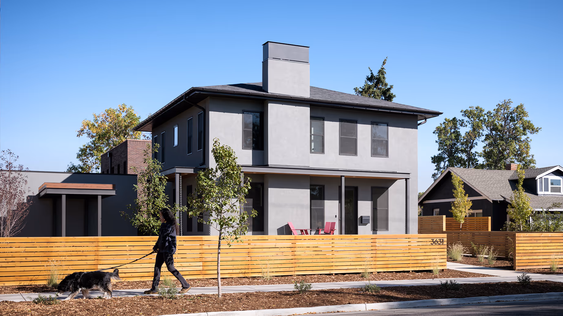 With the Bruce Randolph Avenue Residences, we explored an underutilized housing typology in Denver's zoning code—the tandem house, which allows for two full-size single-family homes on a single lot. Located in Denver's Cole neighborhood, these "build-to-rent" homes reference the historic "Denver Square" form while each maintaining a distinct architectural identity. The front home features stucco and a traditional hipped roof, while the rear home surprises with its brick facade and parapet roof. This project addresses the "missing middle" housing gap by increasing density while respecting neighborhood scale. It offers rental housing with the quality and privacy of single-family homes, providing an alternative to apartment living while maintaining proximity to downtown and transit options. This modest intervention demonstrates how small-scale projects can help address housing challenges while enhancing neighborhood character.