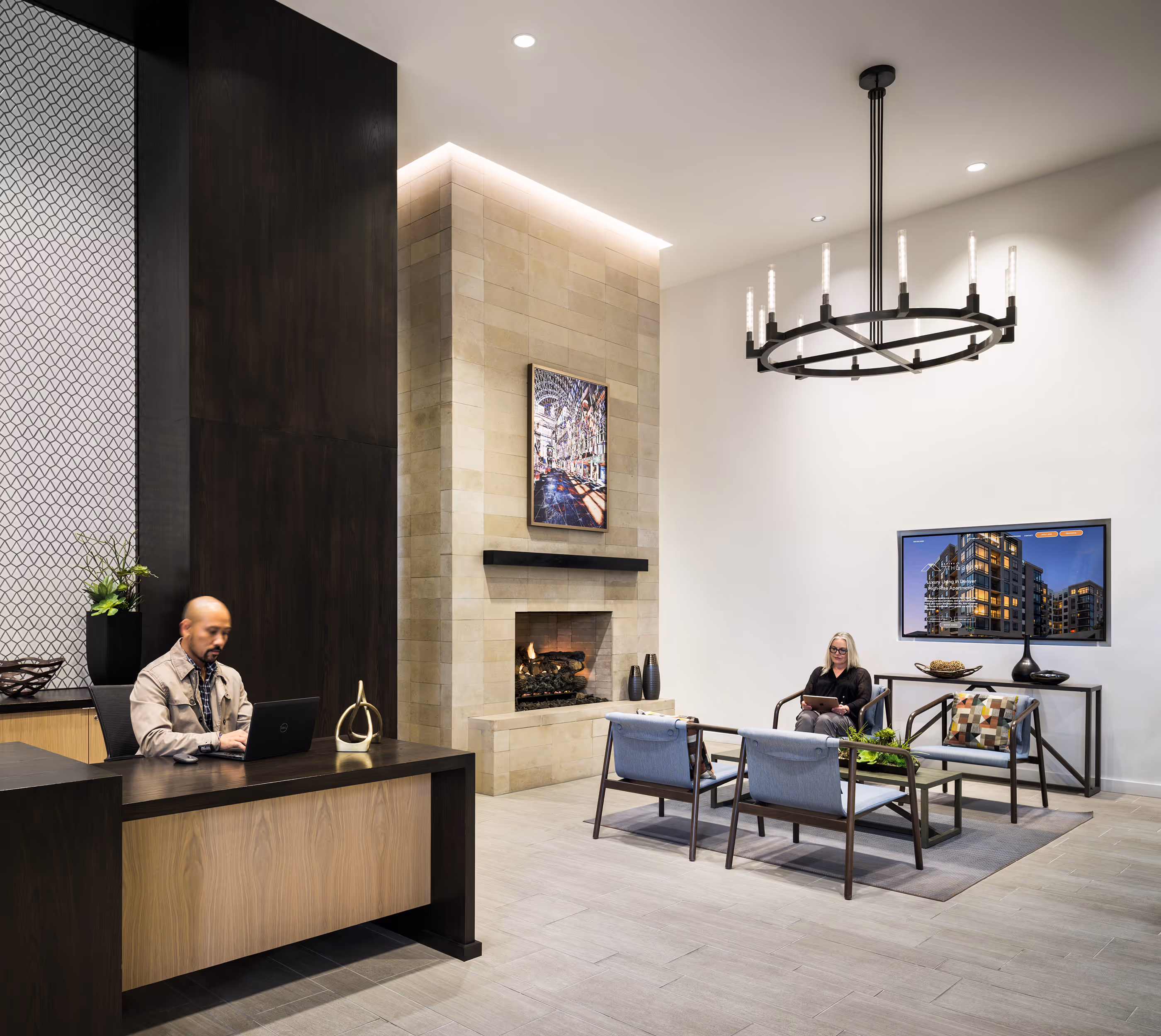 As an urban infill project, on a small lot at the edge of Denver’s Capitol Hill neighborhood, Aspire 7th and Grant goals were to provide a boutique residential property with an intimate scale, yet provide an immediate impression of spaciousness and aspirational luxury. The interior is timeless, elegant with an architectural approach to the aesthetic. The amenity spaces are appropriately scaled activity areas, each room feels comfortable for intimate gatherings, yet interconnected enough to support larger groups. A neutral yet dramatic material palette-of light and dark woods, leather and wool fabrics, honed limestone and polished quartz- plays dark against light, for style without trend.