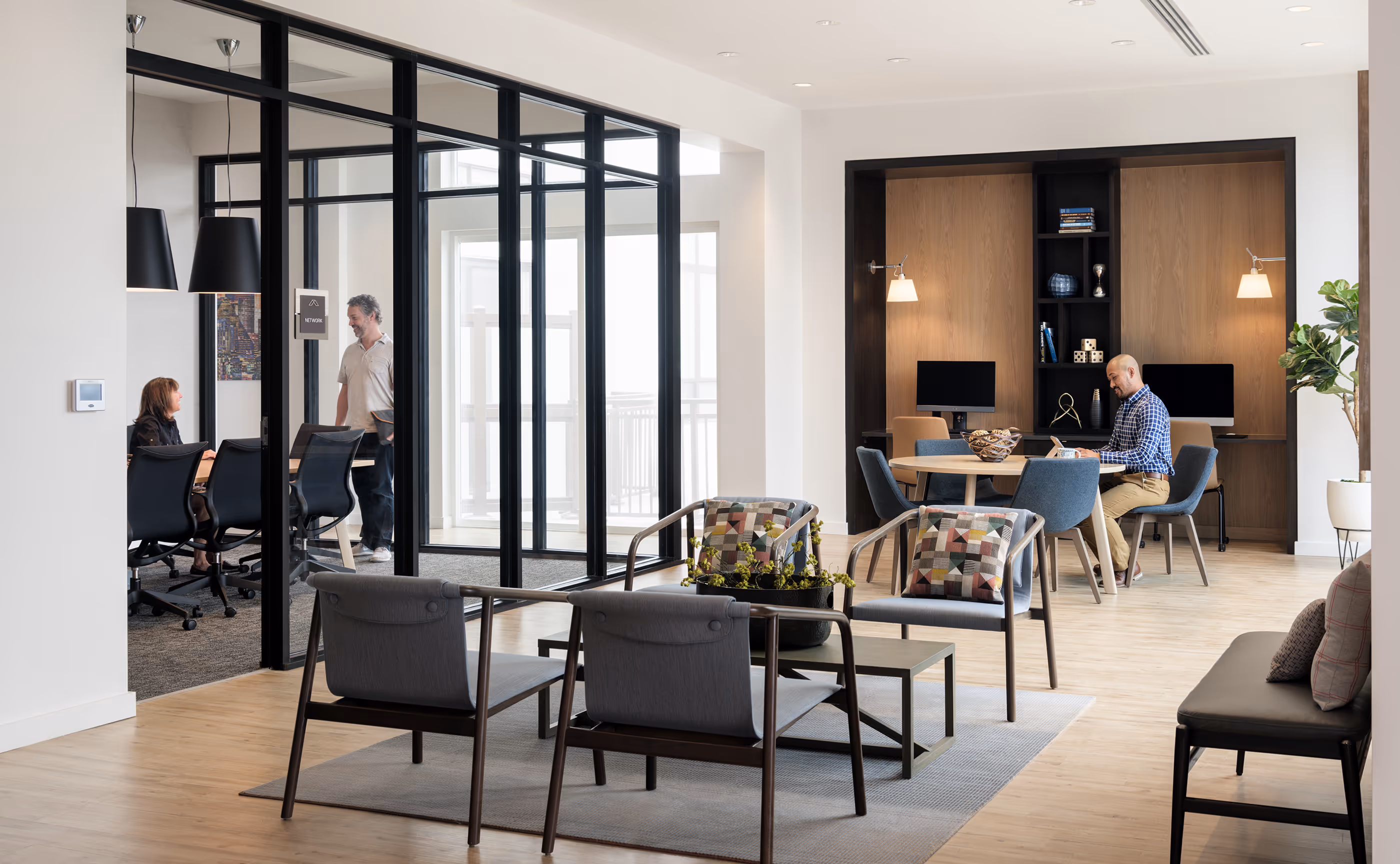 The spaces are intended to feel like an extension of your own living room, inviting yet peaceful. Three primary zones are divided by function. The amenity kitchen and coffee area open up to an outdoor seating deck, and serve as a centralized hub between a workplace area and a living room. In the workplace area, a conference room, conversation group, work table and computer stations serve as extended home offices during the day. In this time of increased remote work, the well-appointed yet calming work areas have become a thriving, indispensable resource for the residents. The kitchen and adjacent coffee bar, can each accommodate small gatherings on their own, or support larger parties. A game room with pool and shuffleboard is conveniently located close to the beverages, and the sequence between areas is intentionally prioritized from busiest to quietest, culminating in an invitingly furnished soft seating group that enjoys spectacular city and mountain views.