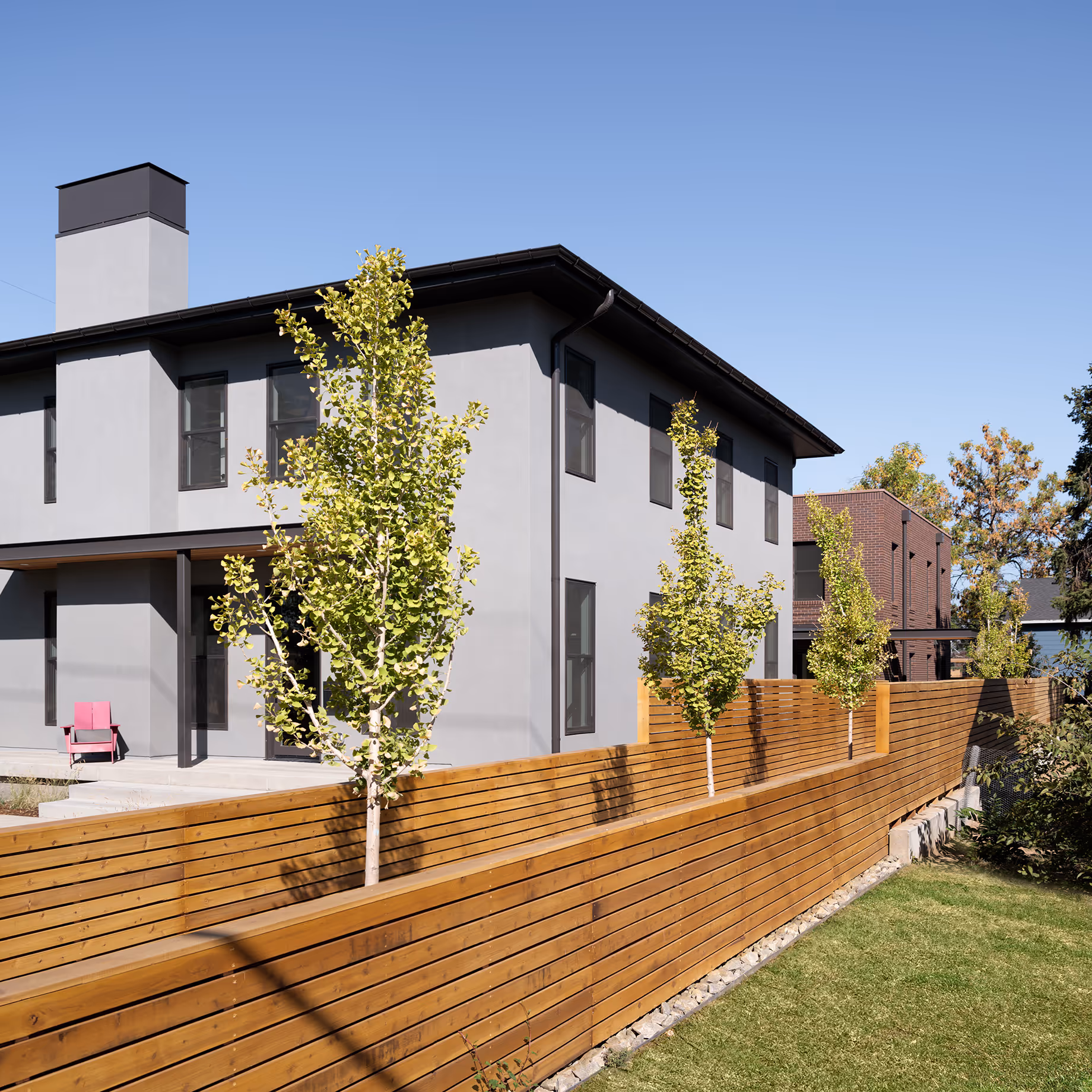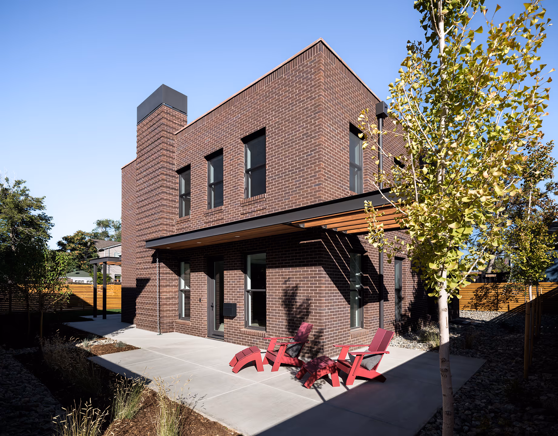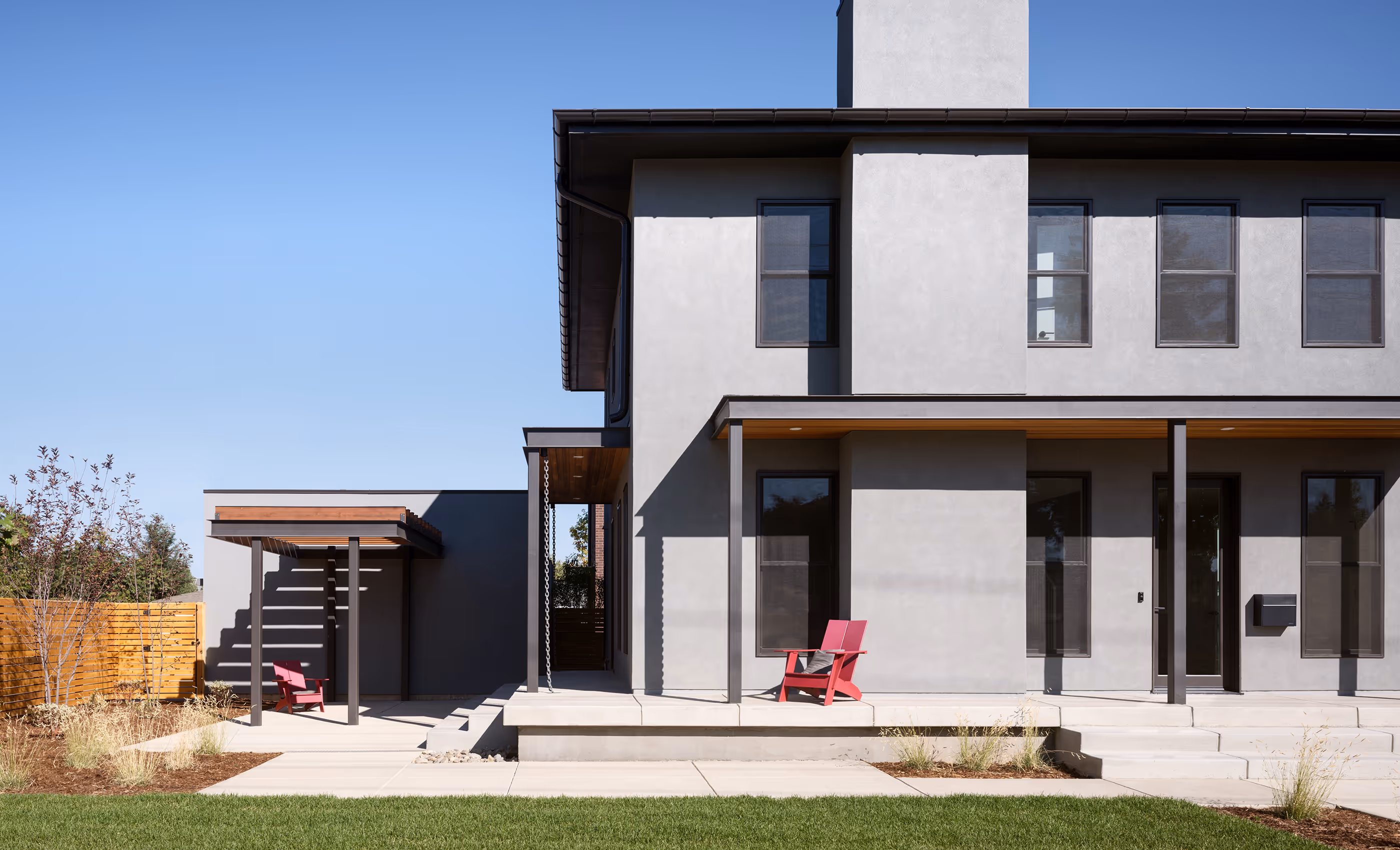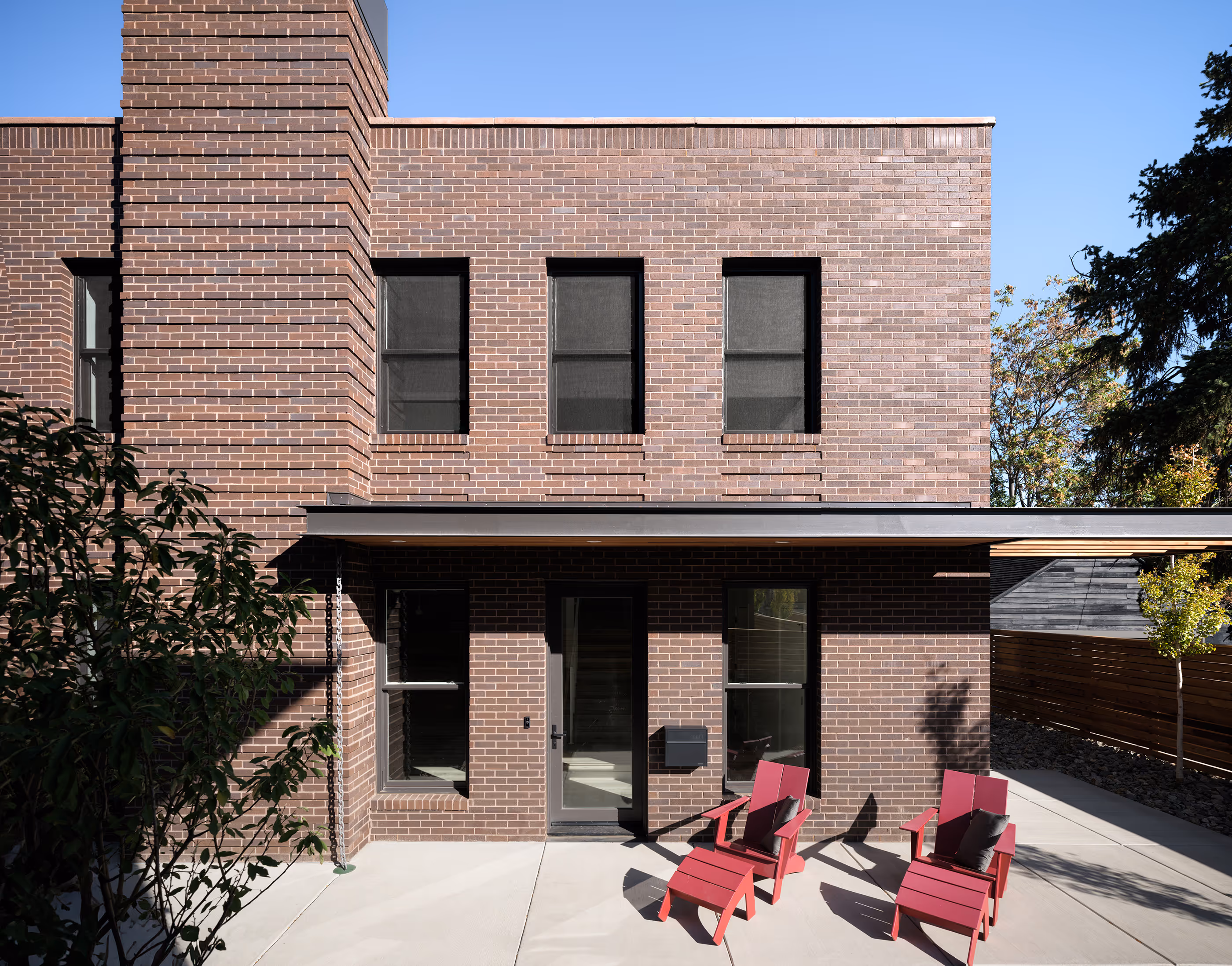 The design approach references the historic “Denver Square” form in planning and massing, and the two homes take on a nuanced difference in their architectural vocabulary, rendering the rear home in brick and parapet roof, as a surprising discovery while the front home is stucco and more true to the hipped roof form of this historic precedent. Each is pared down to the essence of form and materials and carries contemporary steel detailing in front porches and trellises on the site.