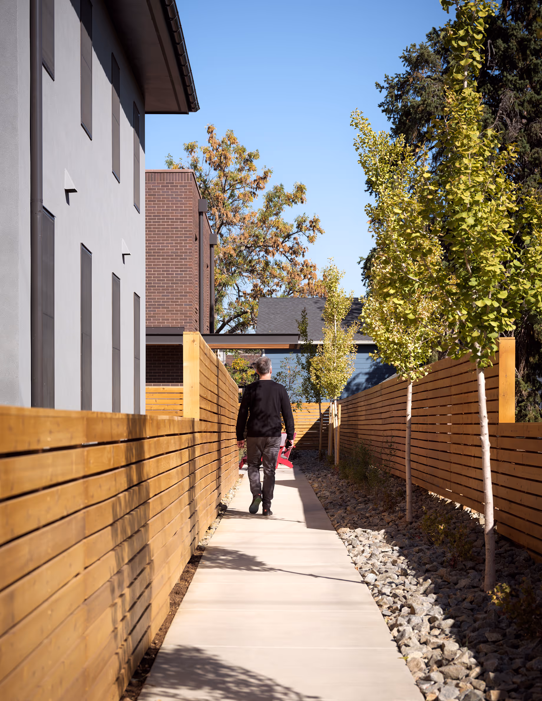 These two, “Build-to-Rent”, ground up homes in Denver’s Cole neighborhood take advantage of a seldom-used building form from the Denver Zoning Code: the “Tandem House”. The Tandem House Form allows for 2 full-size single-family homes, at the front and rear of the property. Upon study and site analysis with the ownership group it was determined that this path was more desirable than a duplex, the other allowed building form in this district. The project replaces a derelict, “outlier” home which sat back an overly large distance from the street and didn’t do much for the neighborhood. In it’s final form, the project presents an alternative to rental apartment living, while still in the city and near downtown and multiple transit sources; a novel offering of a high-quality rental housing option, a small step toward filling the “missing middle” of housing supply.
