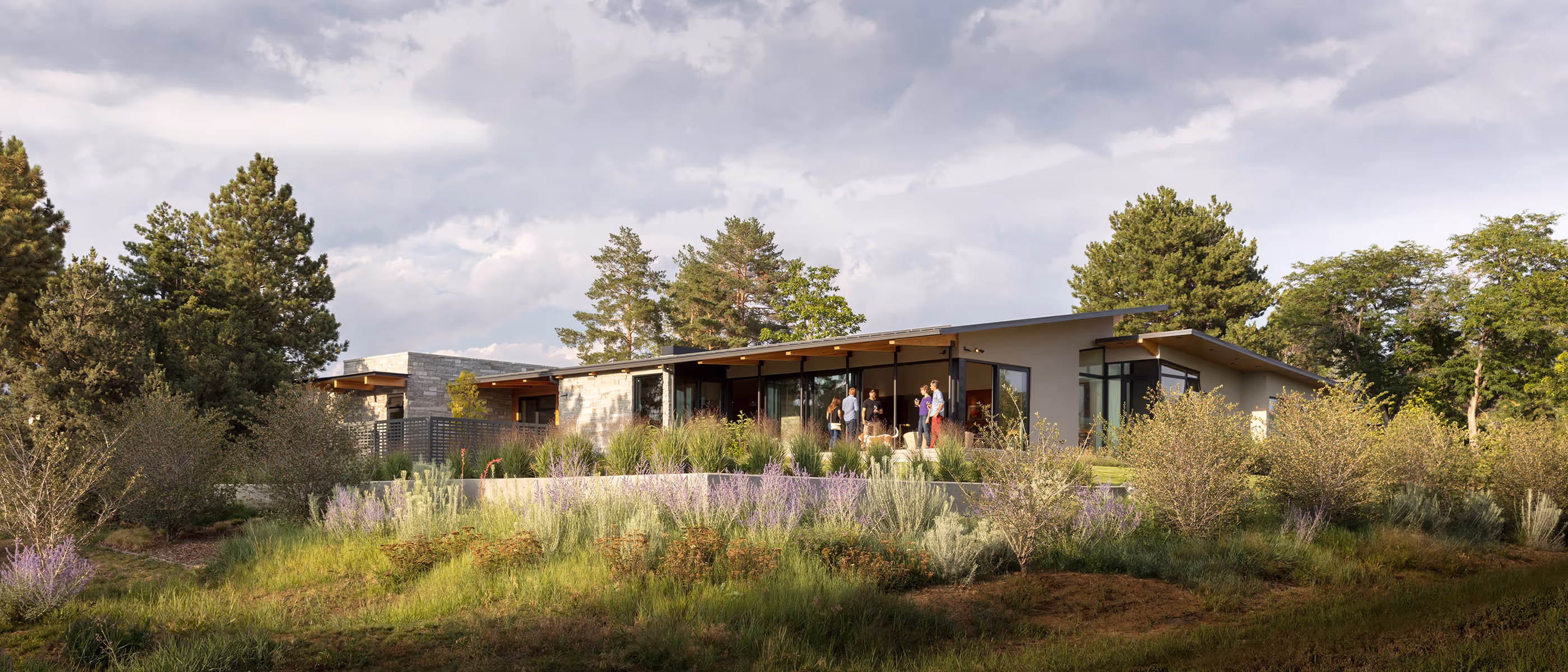 Semple Brown designed this beautiful 7,250 sf home in Cherry Hills Village CO. The site is 1 ¼ acres and offers unobstructed views of the mountains to the west. The program of the residence seeks to find harmony between the alluring views to the west, while passively managing solar heat gain and editing the late afternoon sun. A height limit, as designated by the local covenance, suggested the home be conceived as a low, ranch-like profile, with the primary living areas of the home on the ground floor, and the subsidiary spaces be disconnected and separated in to a split-level form. This allows the clients to live day-to-day in their primary spaces, while physically and mechanically shutting down the secondary spaces not in use.