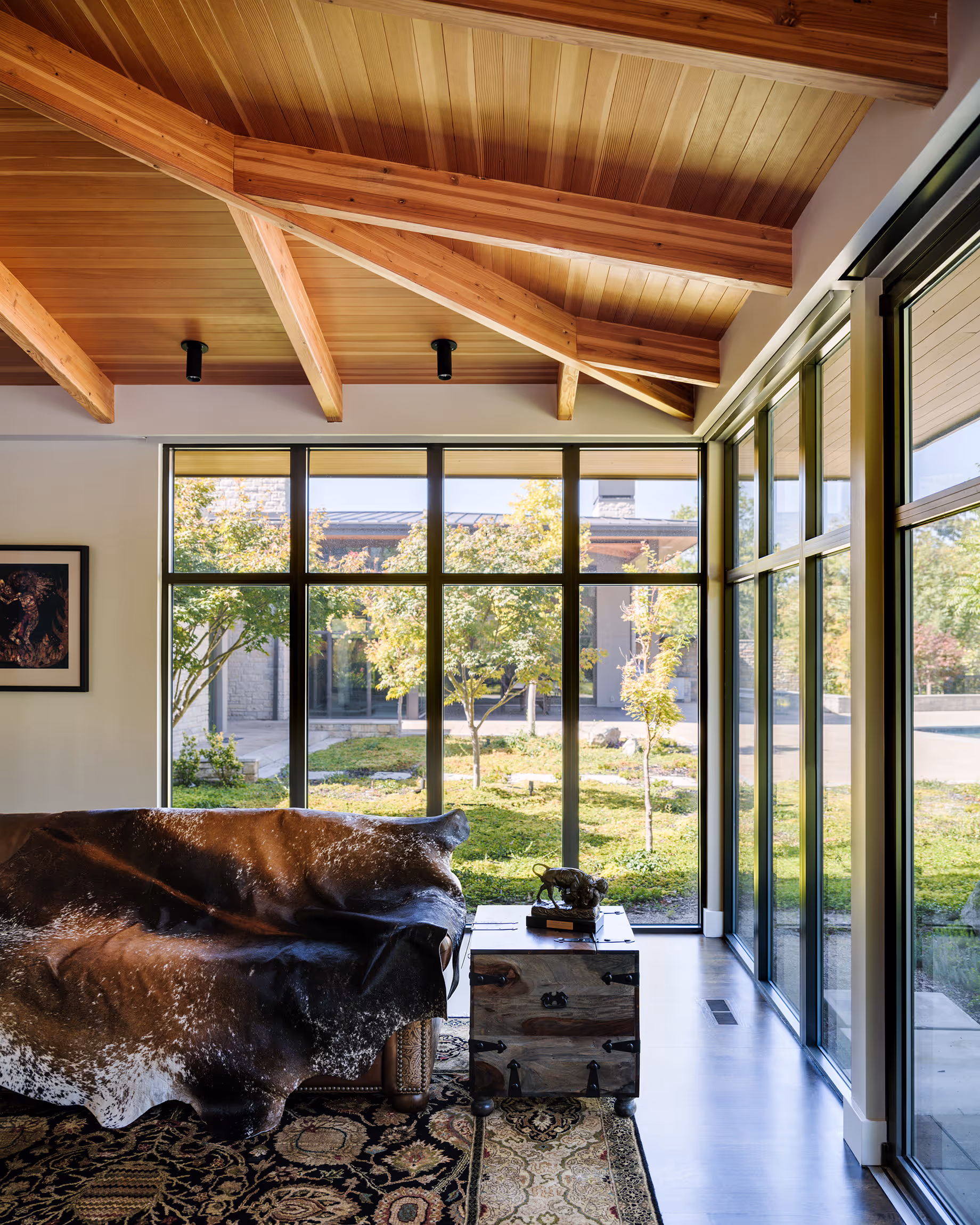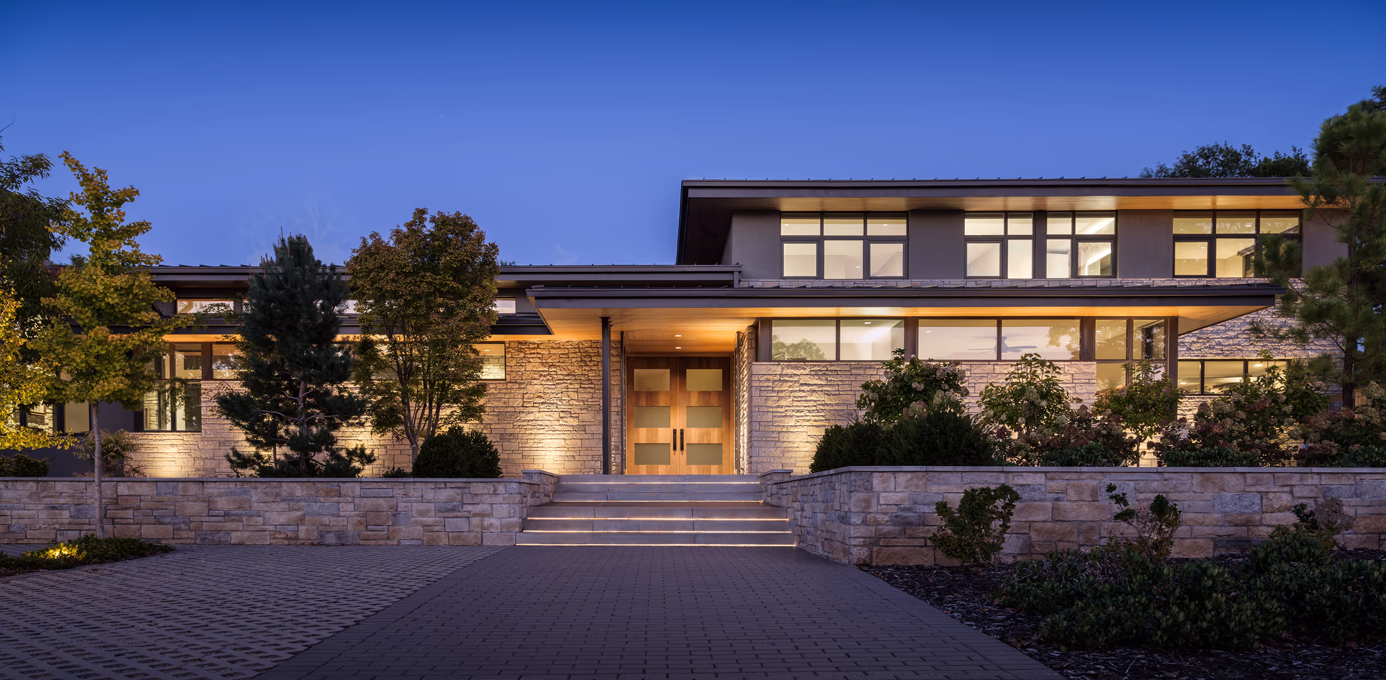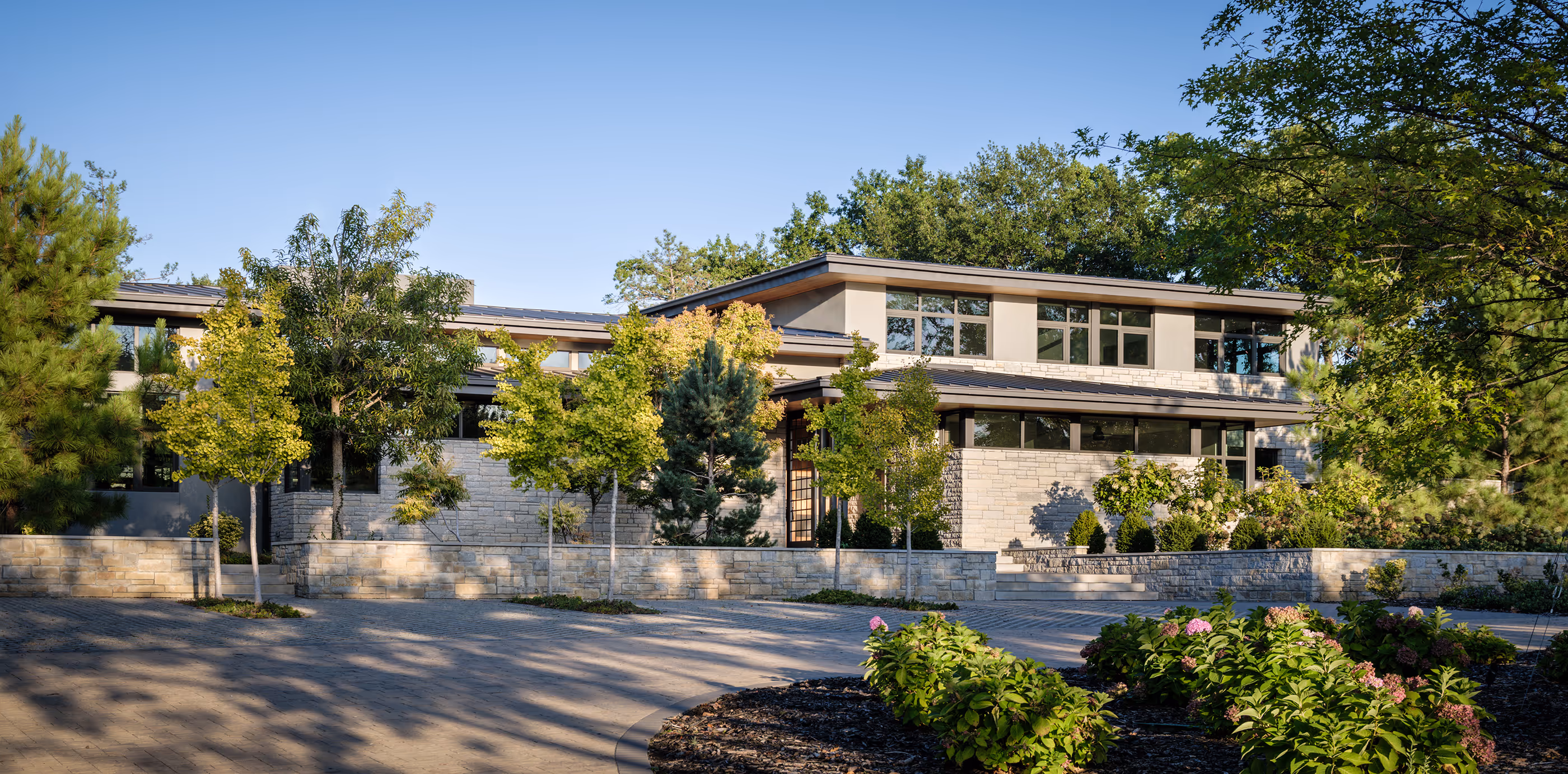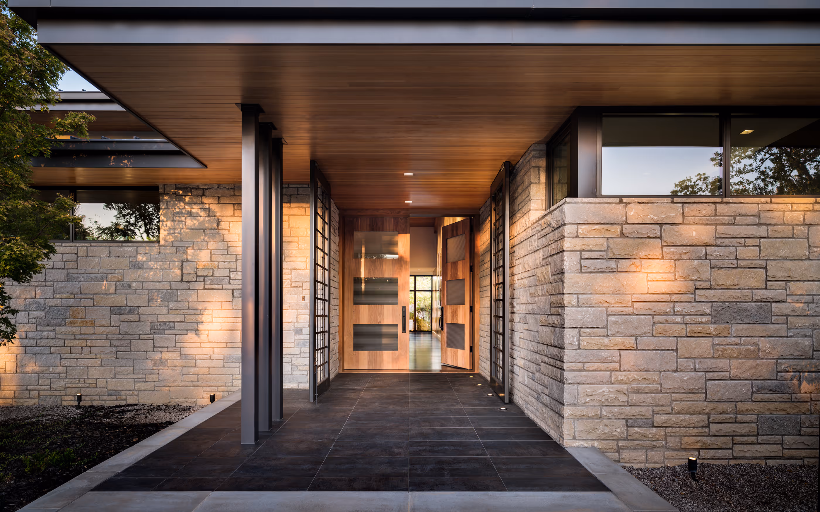 The client was inspired by Prairie Style Architecture to incorporate hipped roofs and horizontal gestures. Throughout, this project has exposed timber beams, local stone, and wood detailing that generate warm textures and help ground the project in its region and history—with a clean and modern sensibility.