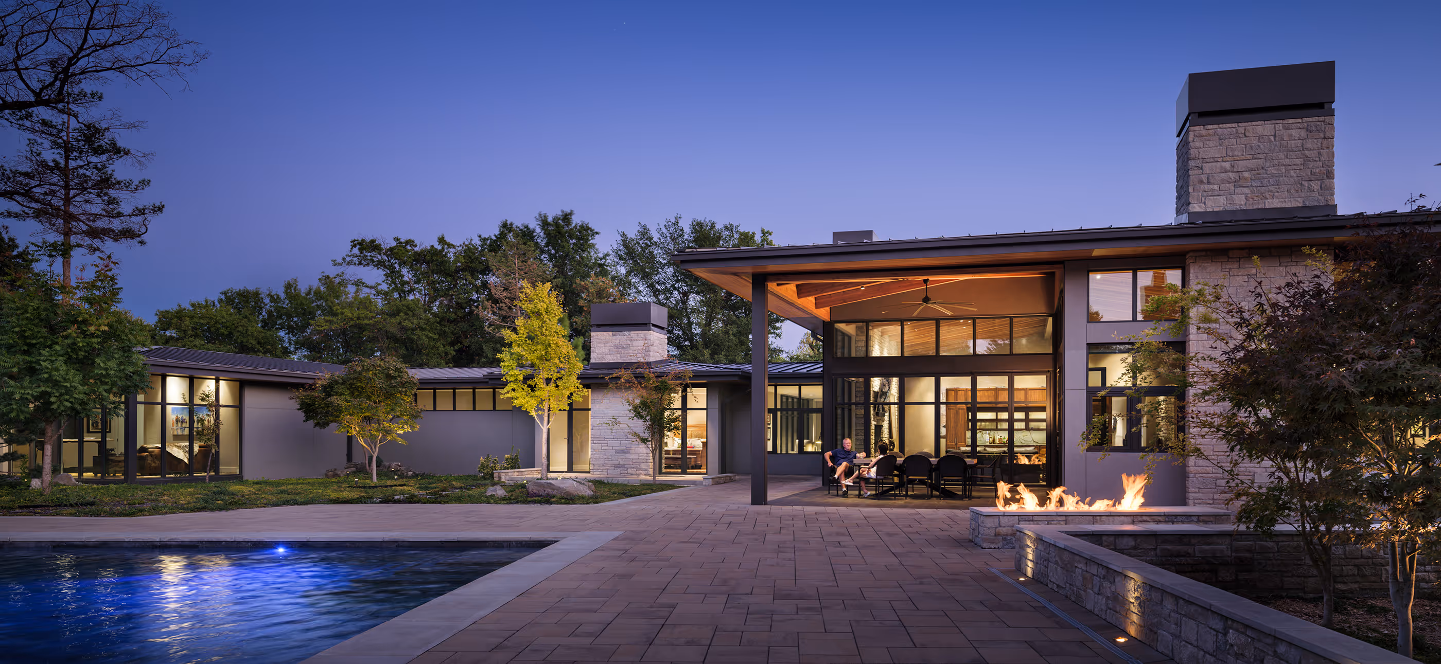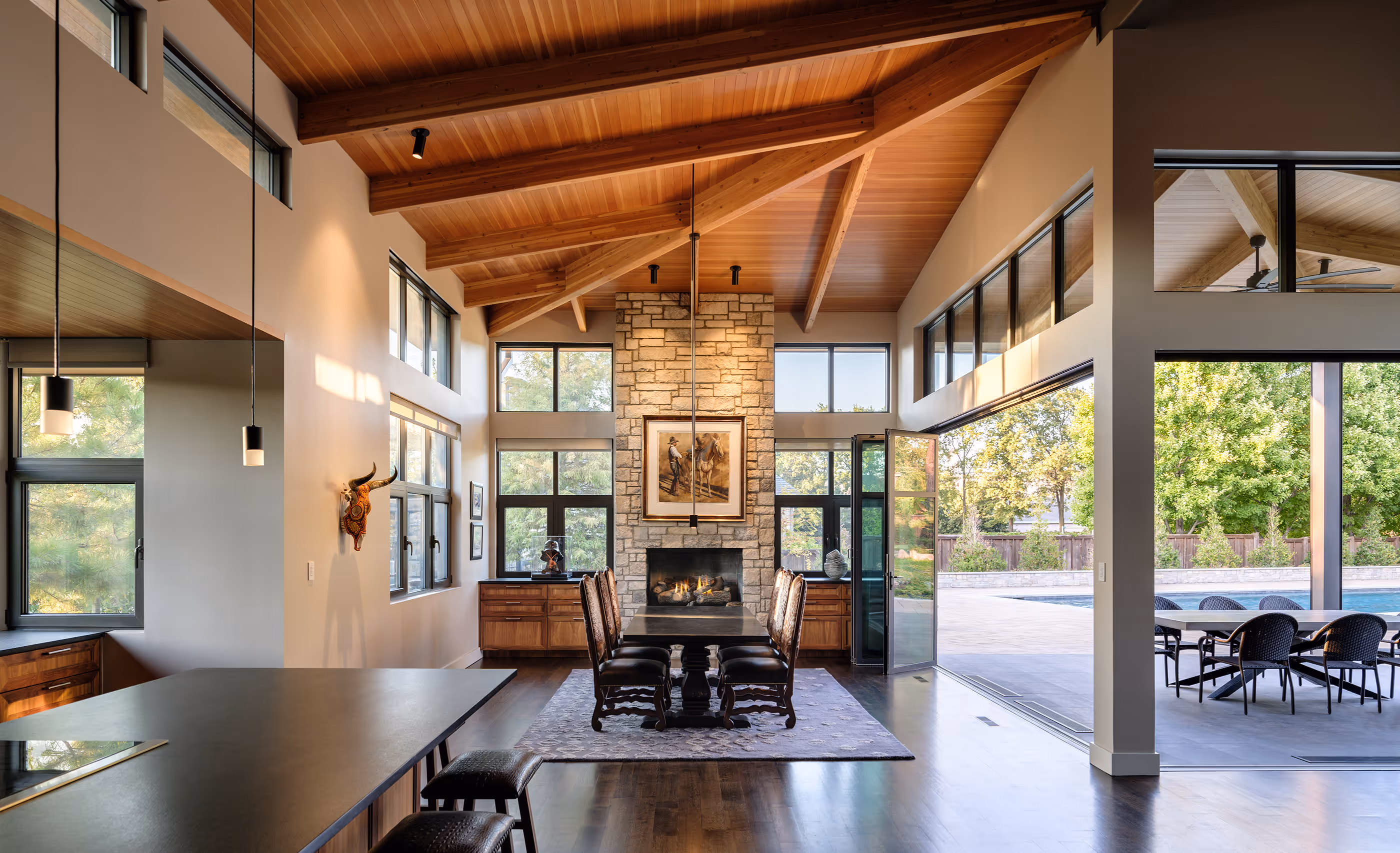 For entertainment purposes, the main living space can fully open to the outdoors, with folding glass walls and roll-down insect screens. For less temperate months, an air-conditioned enclosed porch provides comfortable space on warm Tulsa evenings.