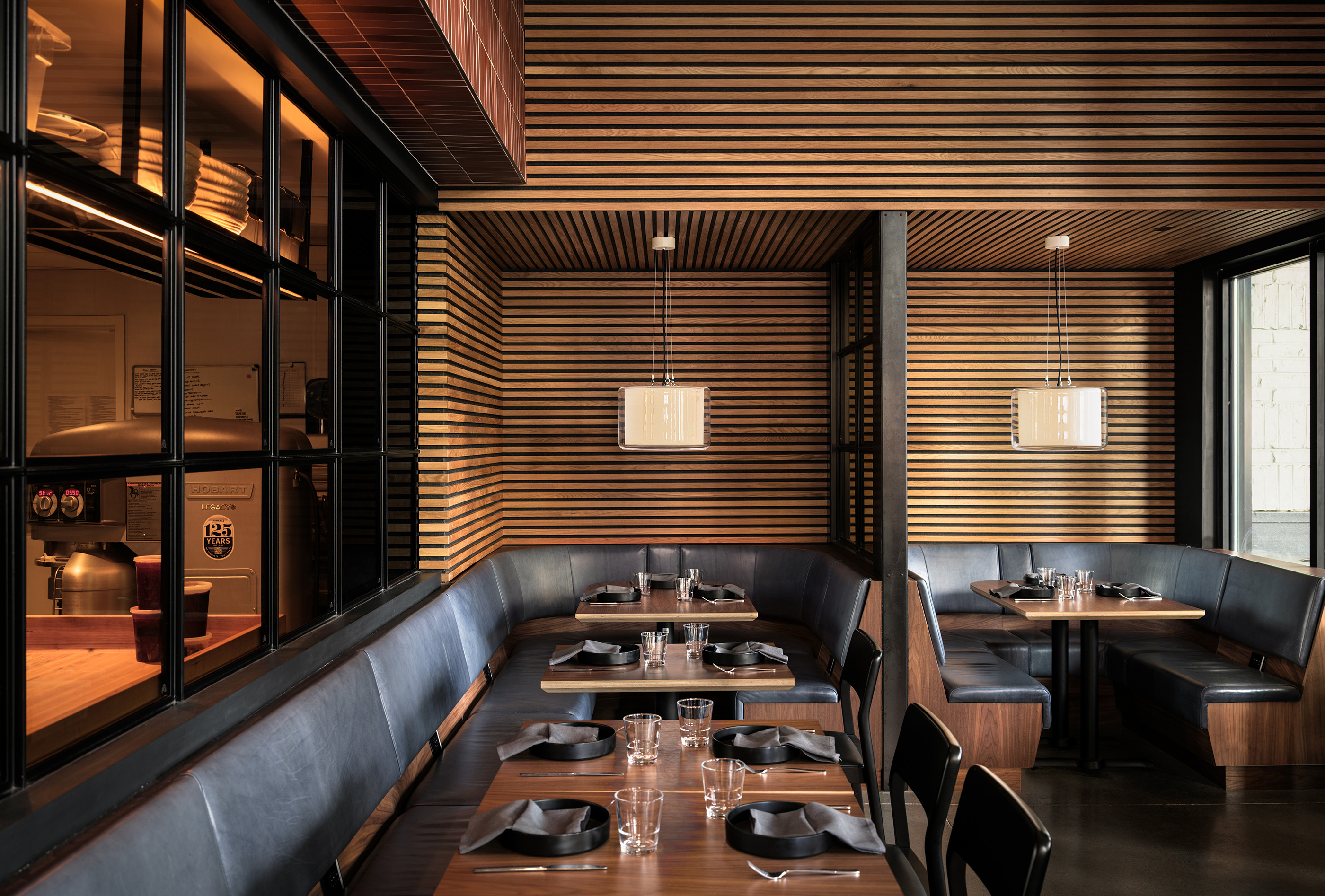 The design reflects the dual nature of the space: an energetic, production-driven kitchen paired with an inviting café environment where neighbors gather for fresh pastries, wood-fired pizzas, specialty coffee, and all-day dining. An open kitchen serves as the heart of the experience, bringing warmth and transparency to the guest area while highlighting the craft and activity behind each offering. Extending the interior outward, the outdoor patio becomes a lively hub for the neighborhood—supporting everything from quick coffee stops to longer meals and casual gatherings throughout the day.