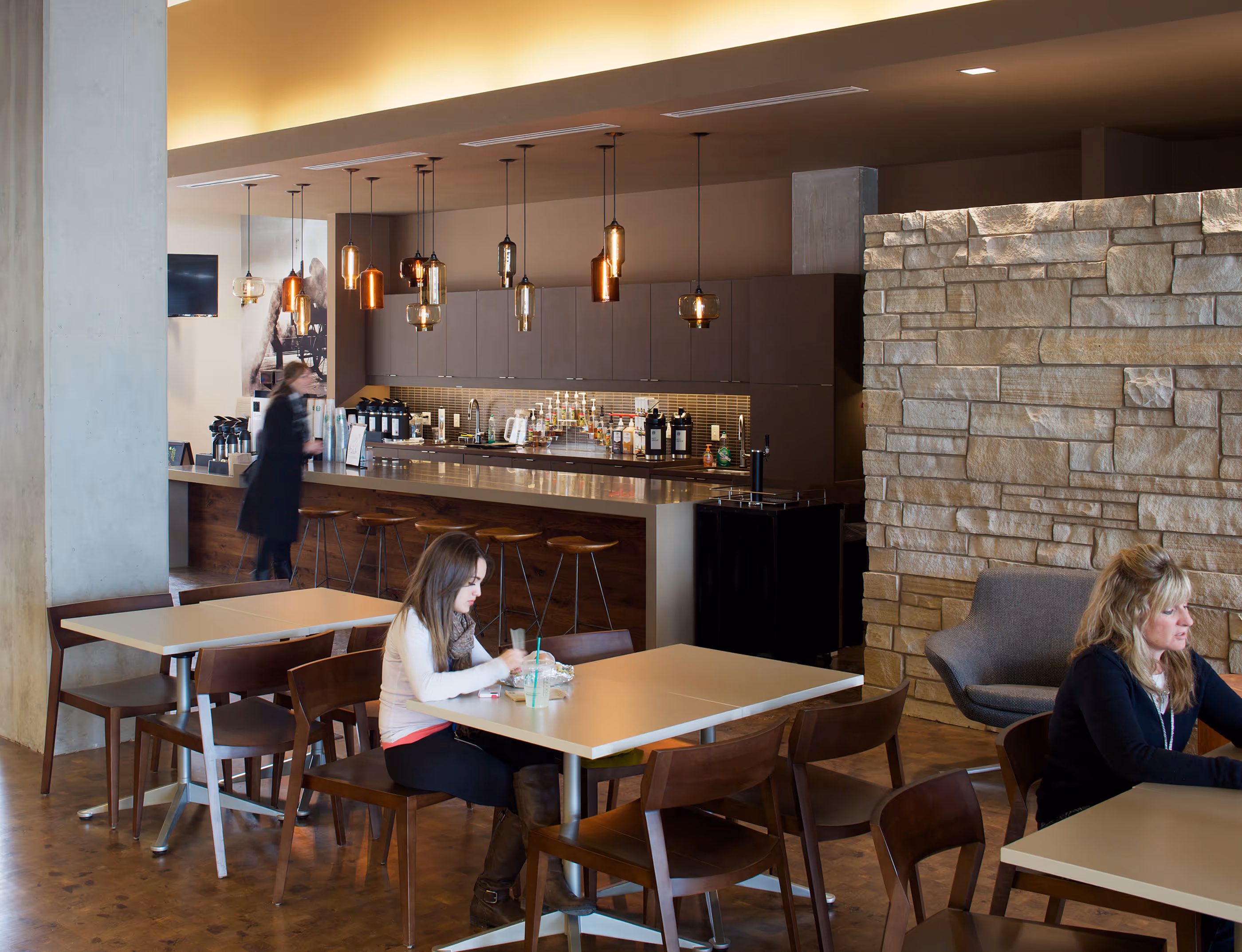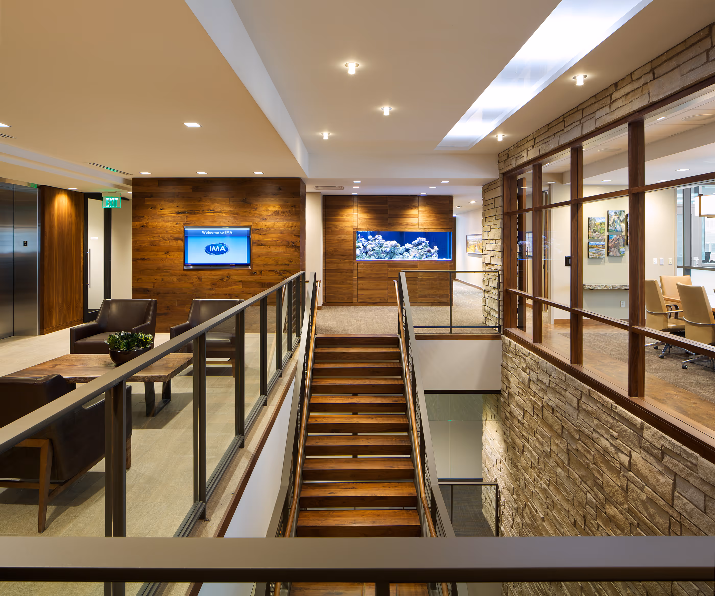 Semple Brown worked with IMA Financial Group to design a new office headquarters around the company’s goal to be the “Healthiest Employer In Denver.” The 65,000 sf facility is designed to encourage interaction and collaboration in an active workplace. A variety of collaborative team meeting spaces supports different workstyles and teams, and an enhanced connecting stair (featuring audio public art) invites staff members to use the stairs rather than the elevators. All of the staff break rooms were combined in a large social/meeting suite on the ground floor, which features complementary healthy foods, a fitness center and Starbucks coffee. The site adjacent to the Denver Union Station transit hub was selected to take advantage of multi-modal transit connections. This project was awarded Leadership in Energy and Environmental Design Gold Certification by the U.S. Green Buildings Council.