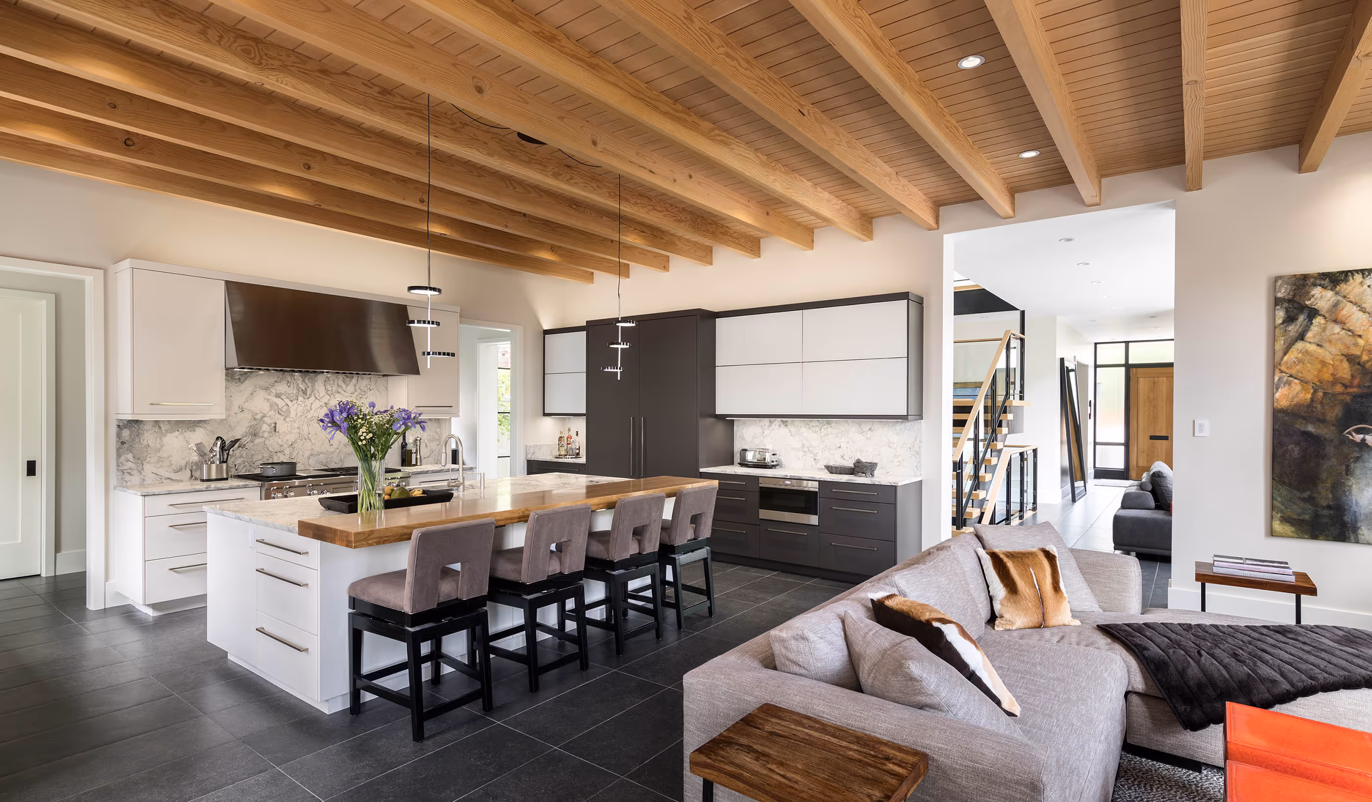The stair overlook and dining area provide the most visual and physical transparency to access hidden gardens and private outdoor lounges. Multiple indoor and outdoor fireplaces as well as exposed wood structure above ensure one is not far from a feeling of warmth throughout the house.