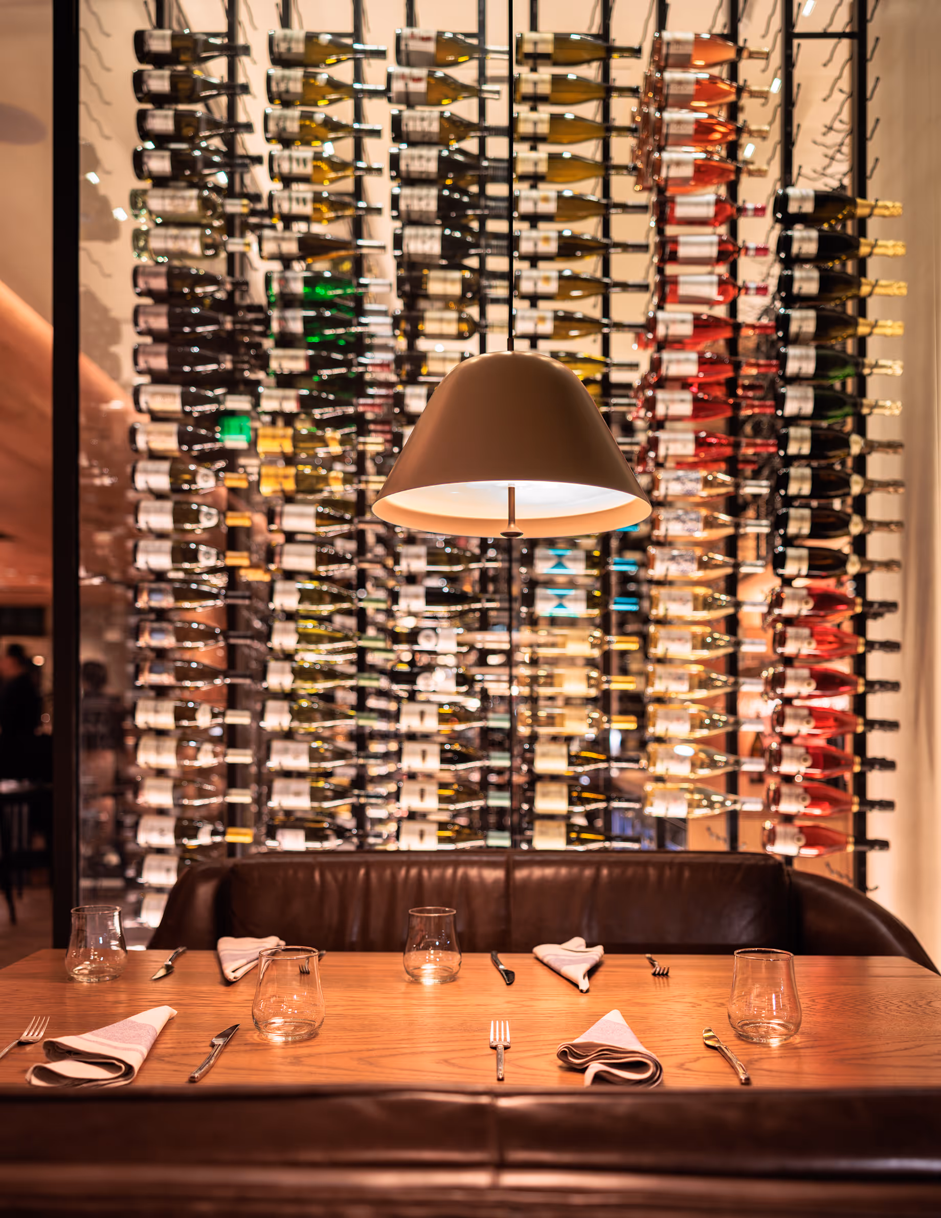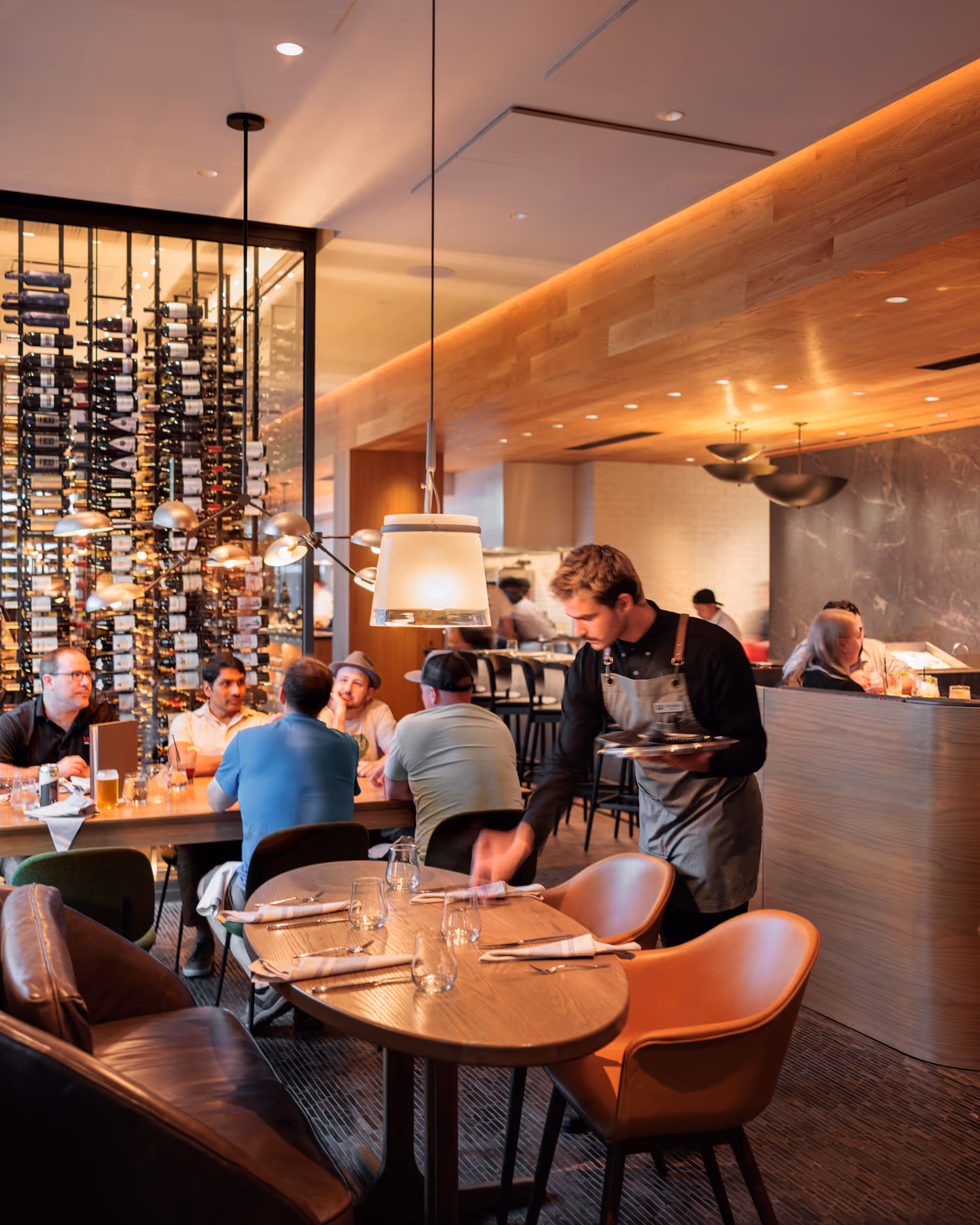 The custom 2,500-bottle wine room visually expresses the beverage program, complimented by custom light fixtures, locally fabricated dining tables and custom-designed leather seating groups.