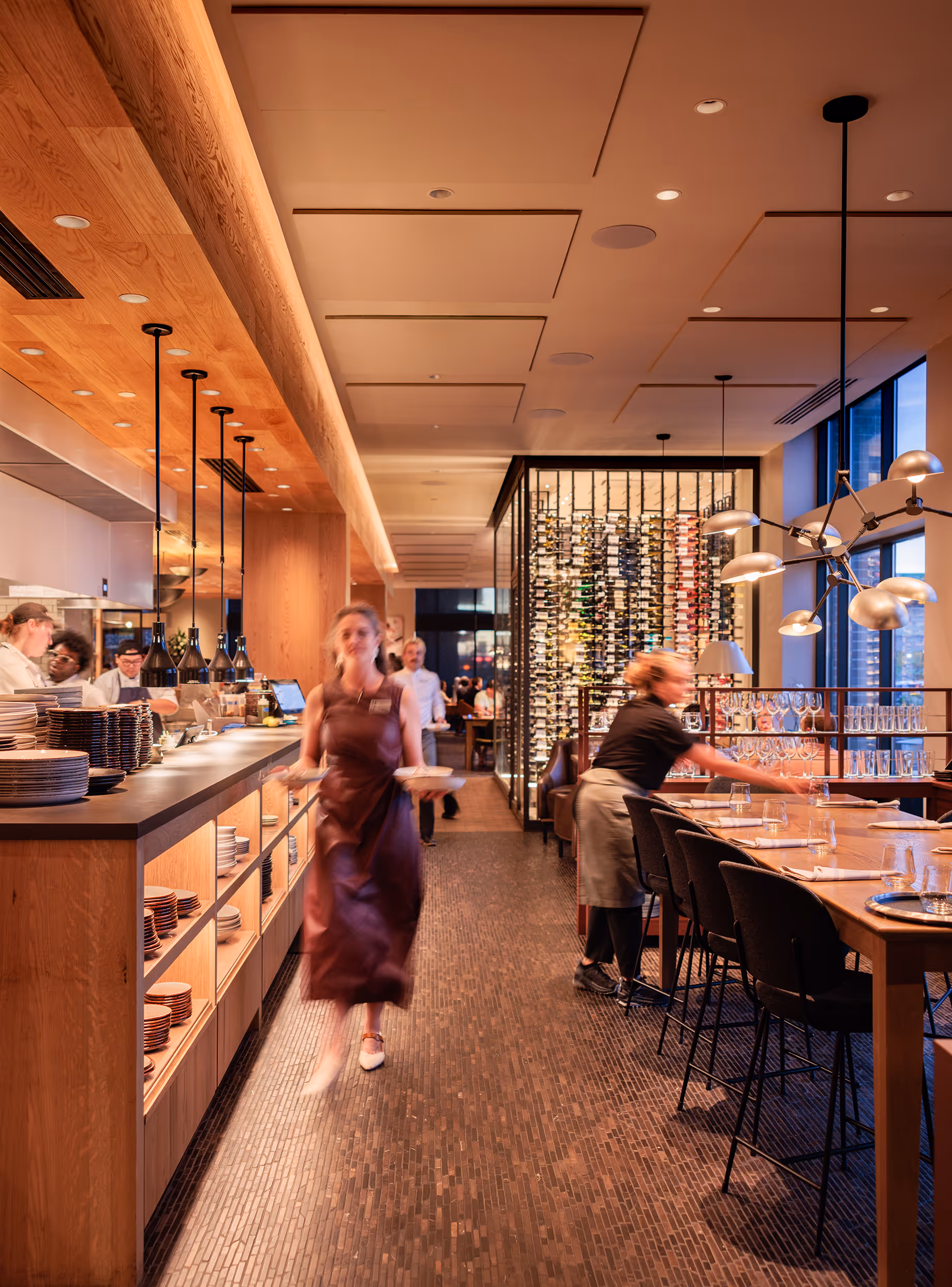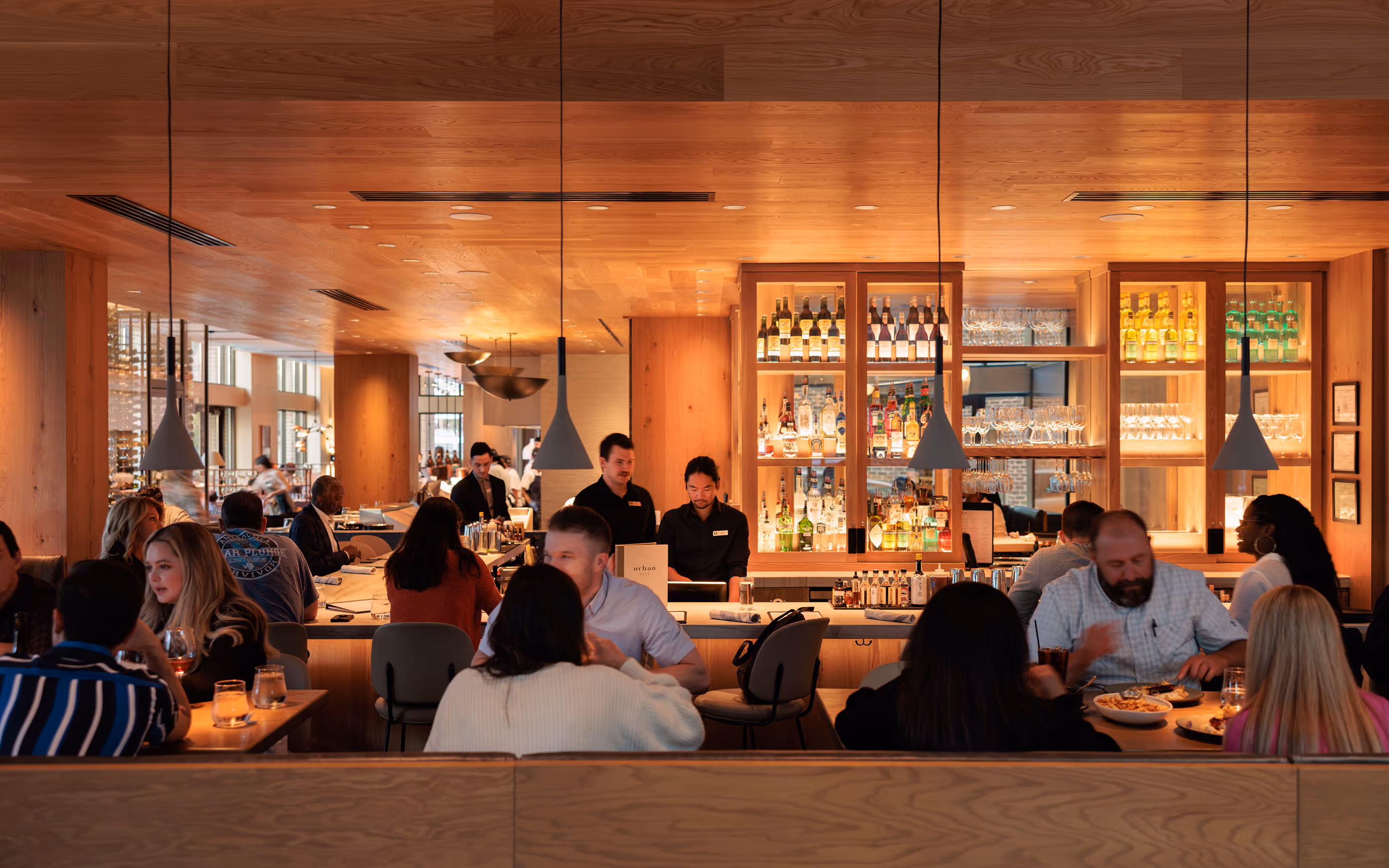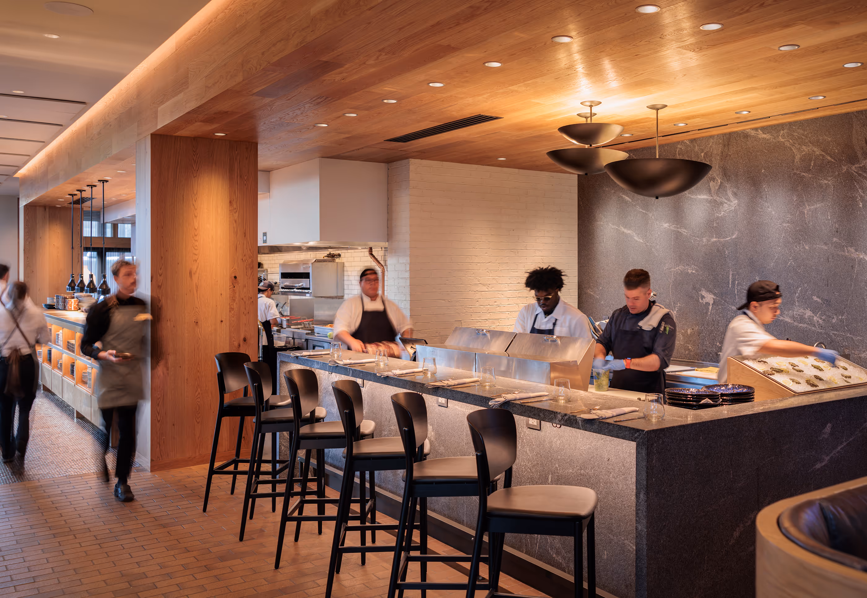 The 7,200 sf interior and 1,900 sf patio feature a glowing corner bar, a wood-fired grille, stone-clad oyster bar and open cook line with chef’s table.