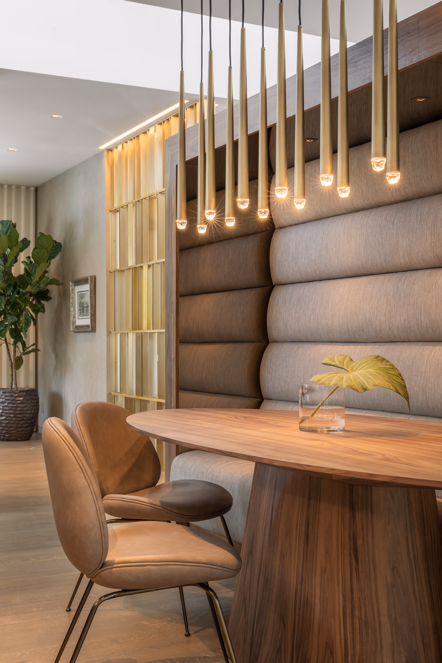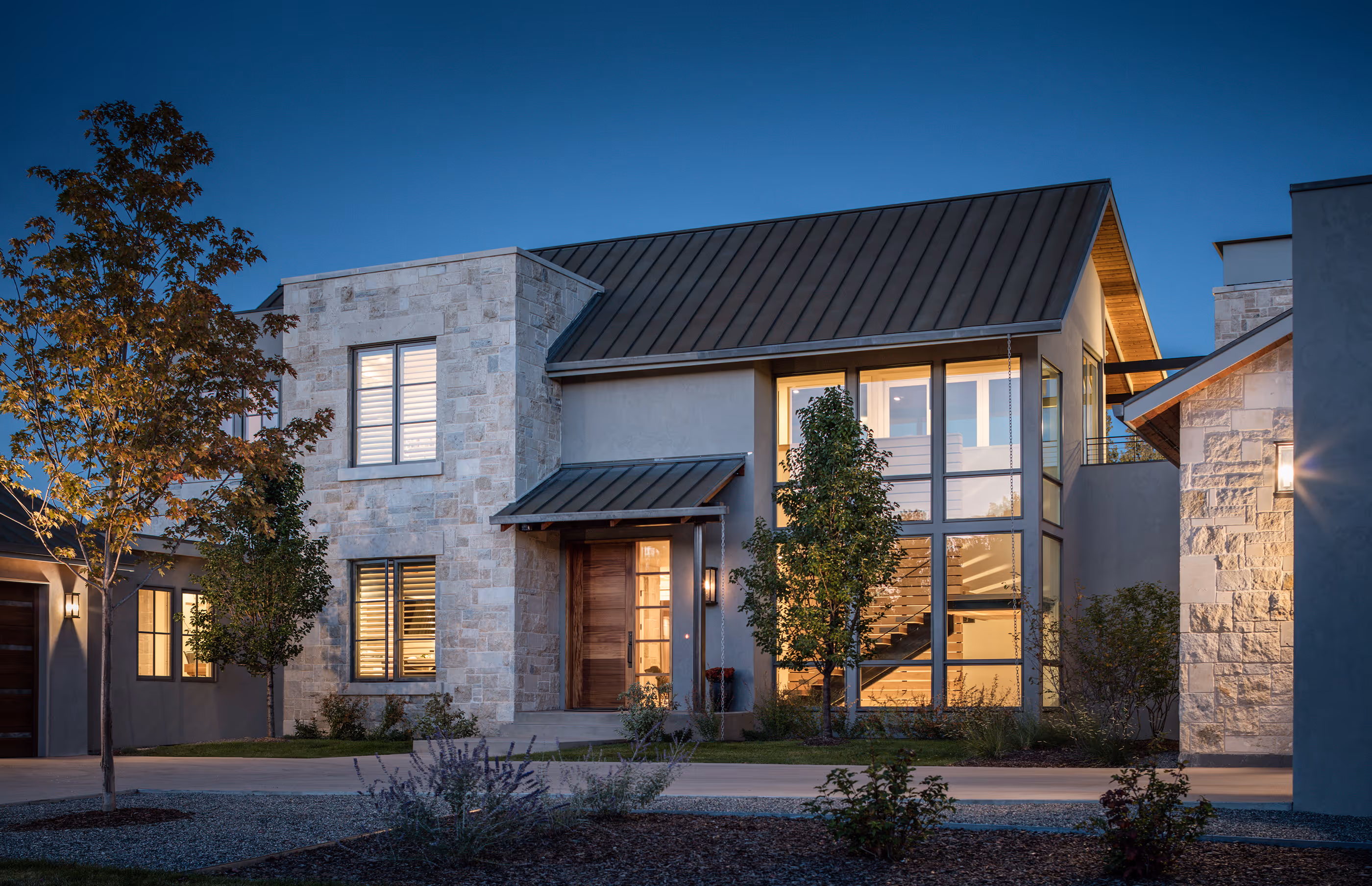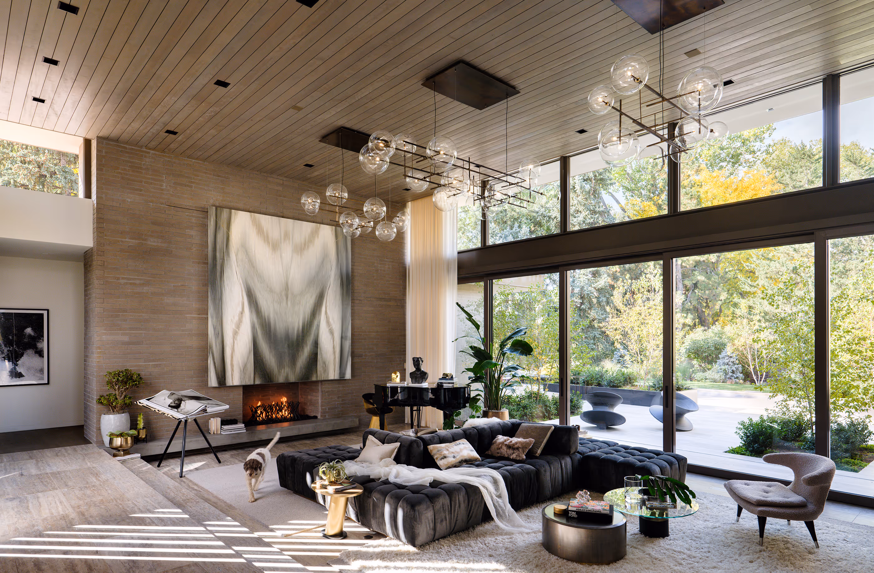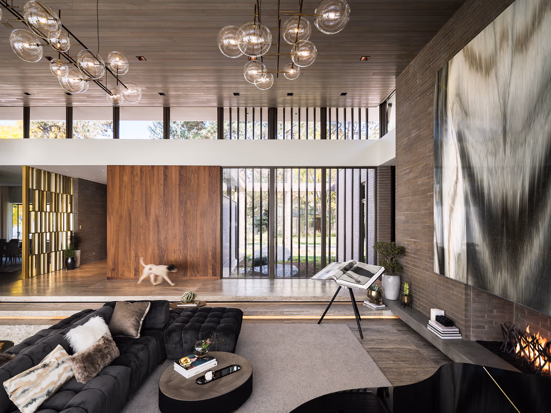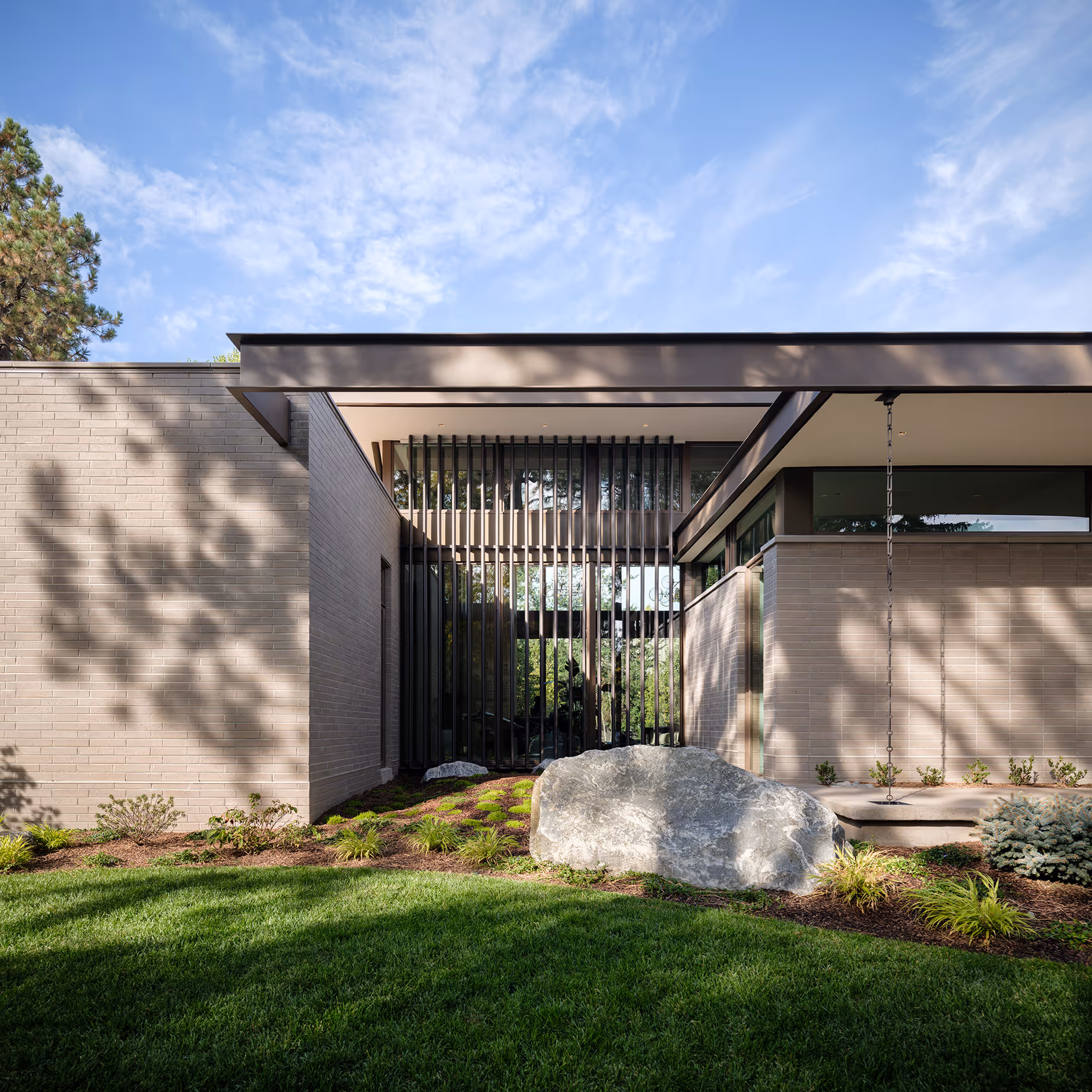 Stylistically, the home carries a mid-century modern influence, in dialogue with an elegant, more eclectic interior design aesthetic. The home is almost entirely wrapped in a warm, champagne-colored brick, set off by moments of chocolate terra cotta cladding. Complementing these choices is the integration of a bourbon-painted structural steel fascia, tying broad eaves together in an integrated expression. Keen attention was given to integration of travertine floors flowing from interior to exterior.