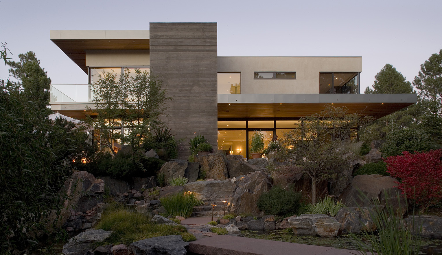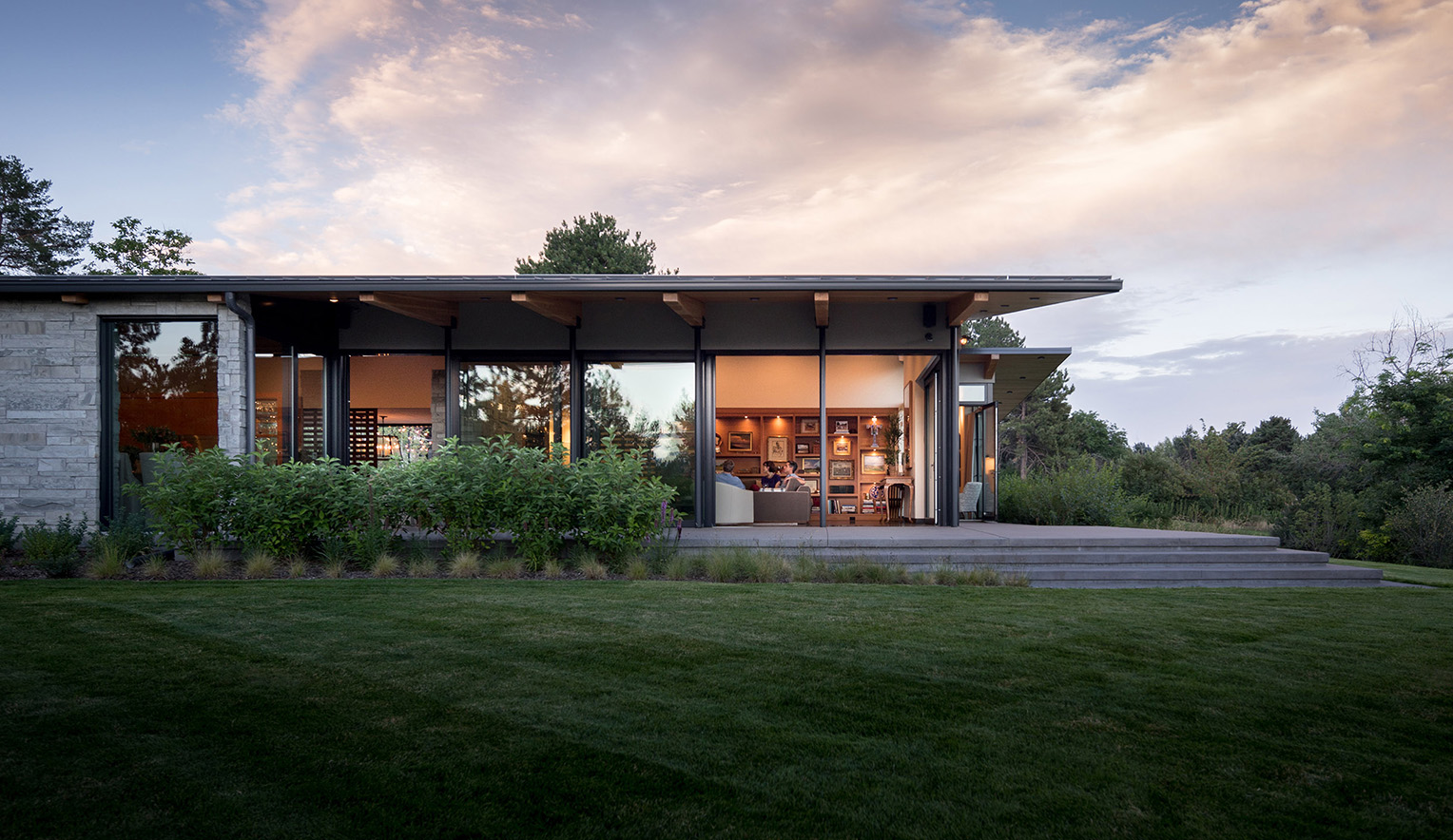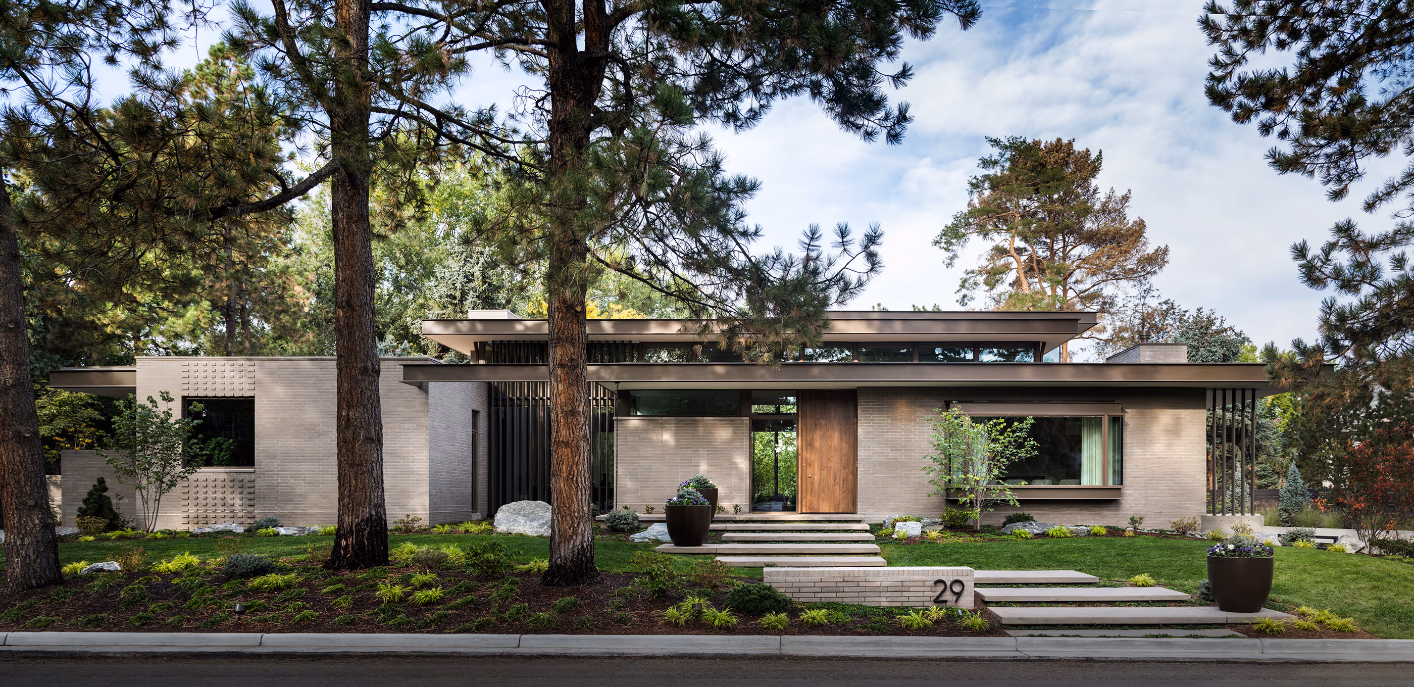 This home eschews the neighborhood’s pitched roof standard and instead provides an elegant, low-slung horizontal solution. The inspiration for the composition came from the owner’s themselves: when pondering best use of the site, arranged sugar packets at the dinner table. Semple Brown expanded on their suggestion, articulating the requested program into an El-shaped form within the required setbacks, creating an outdoor room, the site’s mature trees as third and fourth walls, and Colorado sky as its ceiling. This project was done in collaboration with Studio D Design.