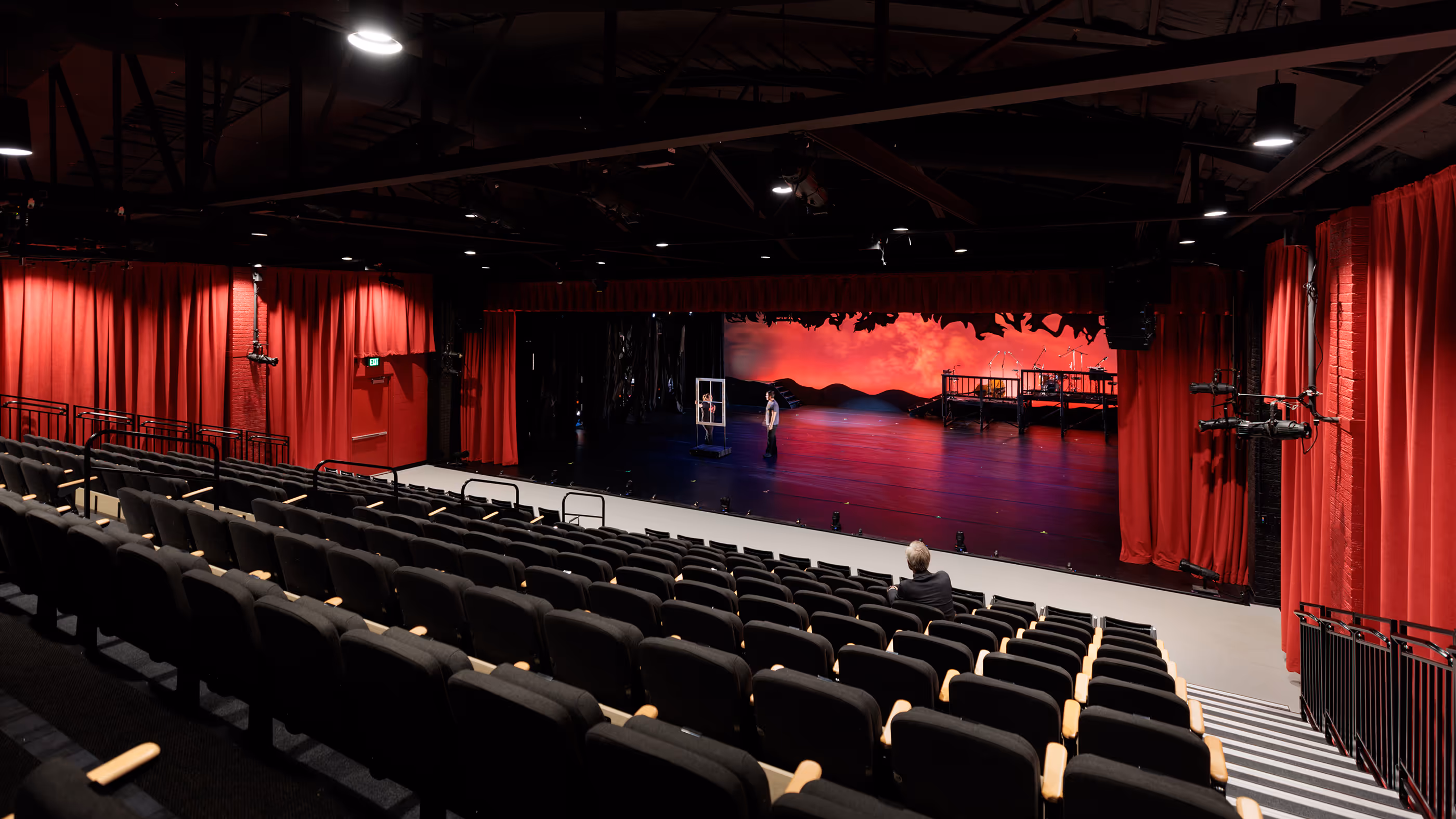 Patron amenities include a suite of gender-inclusive restrooms to speed intermissions, and accessible seating locations at the top row and bottom row of the telescoping seating unit. Support facilities include a dressing suite and green room for dancers, a scene shop and storage mezzanine.